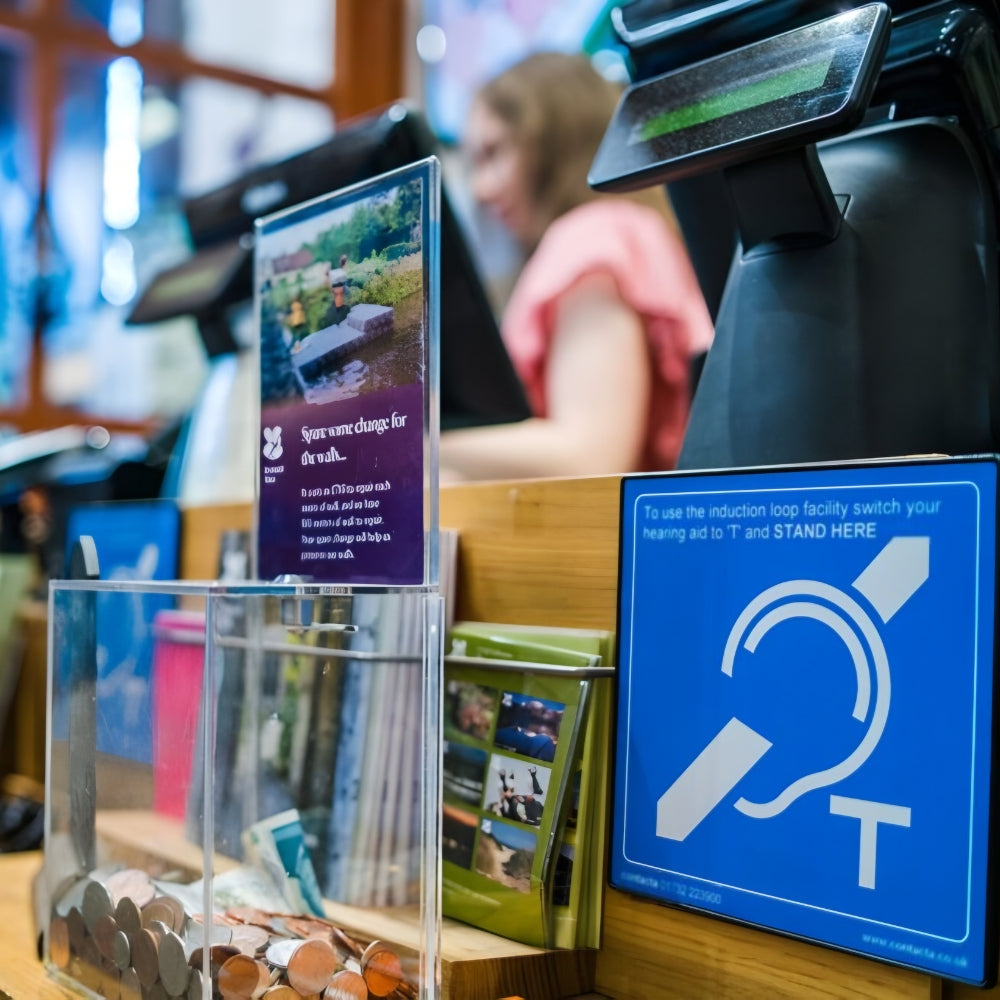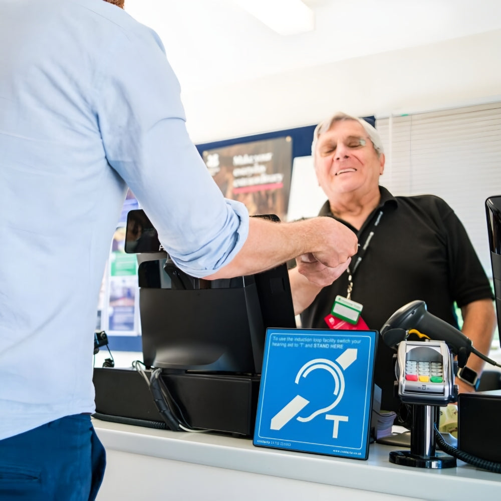 The loop transmits a magnetic field, which enables the telecoil in the customer’s hearing device to receive the signal from the staff microphone via the hearing loop driver. Suitable for mounting on safety screens, grocery check-out lanes, vertical surfaces on counters at banks, or customer service stations.