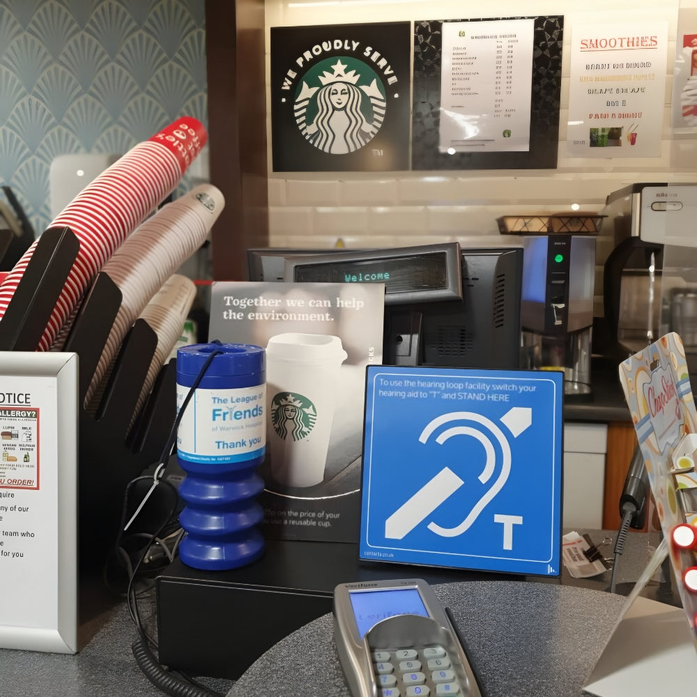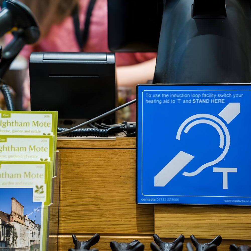 The Contacta IL-AE97 Above-the-Counter Hearing Loop is built into the blue loop sign and designed for installation above the counter.  It can be mounted vertically on a surface or on the counter affixed to a stand.  An adhesive pad and metal stand are provided in the kit for both installation options.