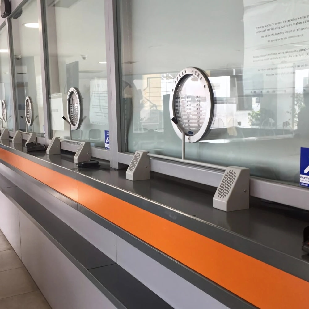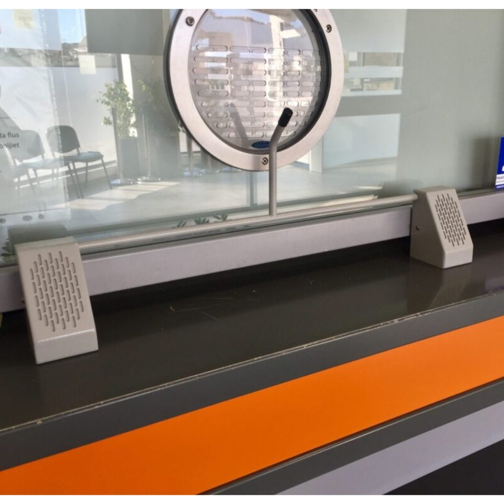 The STS-K001 Window Intercom System features the STS-B80 Bridge Bar Customer Unit with a central microphone and speakers on either side. For the staff, the STS-SU1-3W combined microphone and speaker unit has an adjustable neck and features a three-way mute switch. The kit comes with an IL-AE99 under-the-counter hearing loop aerial. It is ideal for a variety of environments, whatever the ambient noise conditions.