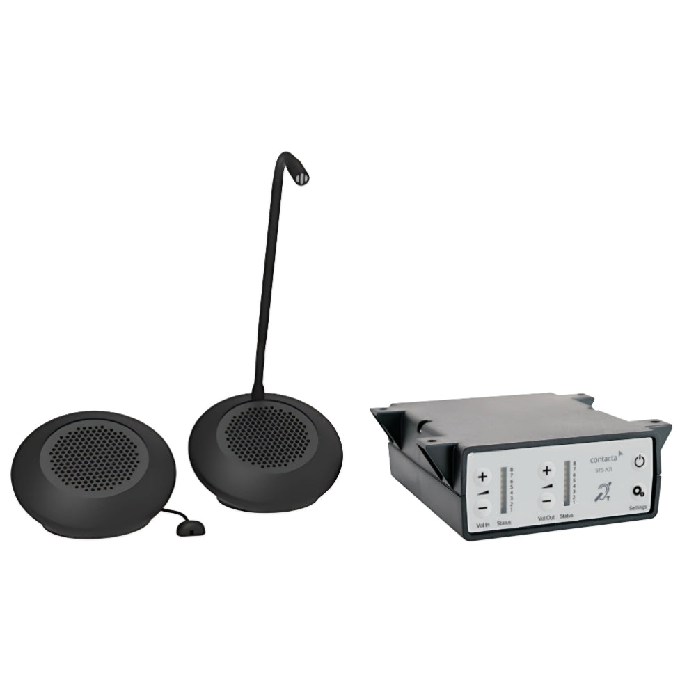 The STS-K071 Window Intercom System is an entry-level kit that provides high-quality sound across partitions and safety screens, featuring a customer speaker pod that can be free-standing or surface-mounted and a staff loudspeaker pod. For the staff side, a combined speaker and microphone staff unit is included, making the system suitable for environments with moderate ambient noise.
